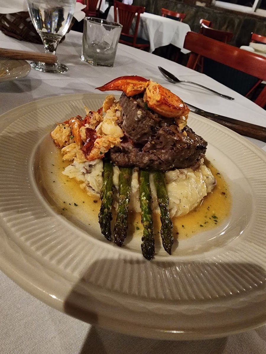 I had a friend in Newport who recommended this place. Beautiful, architecturally interesting farmhouse with eclectic interior design. The kitchen was a bit behind, but they were upfront about the wait and the server was engaging, and the manager came around to talk to us during the wait. I enjoyed the lobster stuffed filet, and was shocked to see the huge chunks of crustacean packed into the meal, which was frankly too large to finish in one sitting. French onion soup had unreal quantities of Gruyère and a terrific crouton, and the addition of a Quahog to every entree was welcome. My friends had scallops and salmon, which they were suspiciously reluctant to share. Wine menu was solid, with a wonderful Malbec to accompany the surf and turf. Charmingly, they had old menus and a history at the door. Will definitely be back on my next trip to RI.